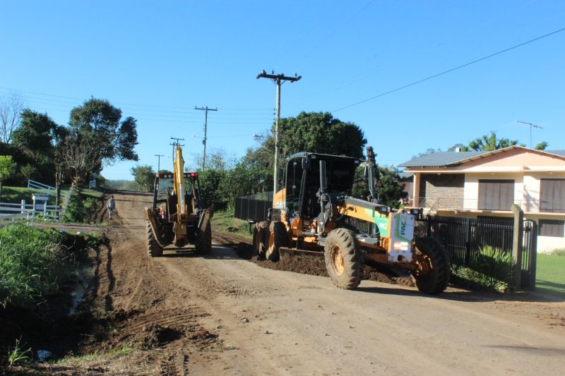 Após dias consecutivos de pancadas de chuvas, a Secretaria de Obras iniciou essa semana o trabalho de recuperação das estradas do interior. Dividida em três frentes, parte da equipe atuou na localidade da Medianeira, outra nas estradas geral e secundárias de Palmas e a terceira em Linha 32/Canudos, executando melhorias por meio de mutirões de máquinas. Adotado em 2010 pela administração municipal, o Mutirão de Máquinas consiste no atendimento às estradas do interior, por meio de um agendamento ordenado, no intuito de atender todas as comunidades da mesma forma. O trabalho é realizado com o deslocamento dos maquinários necessários para executar os serviços de limpeza das valas, roçada, patrolamento e colocação de material nas vias. O principal objetivo do sistema de mutirão é prestar um serviço de qualidade à comunidade, com economia aos cofres públicos, já que os maquinários deslocam-se de forma organizada para as localidades, executando todos os serviços necessários numa única ocasião. De acordo com o cronograma da Secretaria de Obras, as demais localidades receberão os serviços de melhorias nas próximas semanas, analisando condições e fluxo de trafegabilidade. Legenda: Máquinas trabalharam essa semana em Palmas. Fotos: Maica Viviane Gebing Texto: Assessoria de Imprensa