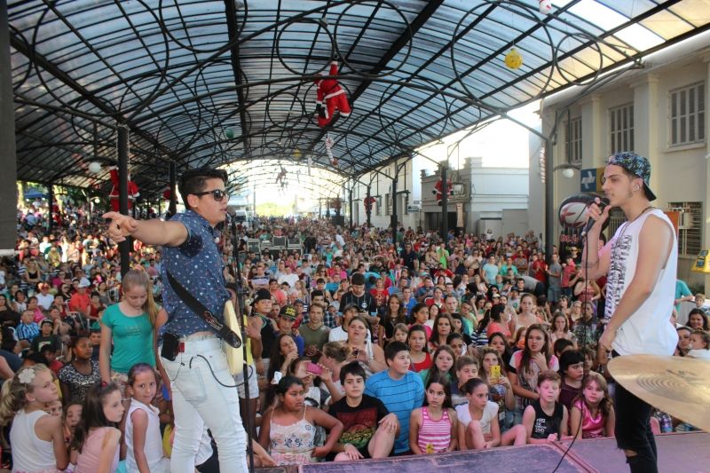 ARROIO DO MEIO – Mais de sete mil pessoas lotaram a Rua de Eventos e o entorno da Praça Flores da Cunha no entardecer do domingo, 29, para comemorar os 81 anos de aniversário de Arroio do Meio e cinco anos de atividades da rádio Emoção no município. A programação iniciou às 17h e seguiu noite a dentro, com shows das bandas Modello, Jonas e Lucas, Sétimo Sentido, Porto do Som e Misturadão, sorteio de brindes, show de fogos de artifício e demais atrações. Às 21h foi realizado um momento solene, na presença do Prefeito Sidnei Eckert, vice Áurio Scherer, Soberanas Aline Conrad, Tainá Guillante e Vanessa Schneider e representantes da rádio Emoção. Na ocasião, a arroio-meense Simone Buttini interpretou o hino do município, contagiando o público presente. Em um discurso emocionado, Eckert cumprimentou a comunidade pela data festiva. –Momento de alegria e orgulho para todos nós arroio-meenses, natos ou de coração–, exaltou. –É com a união de muitas forças, de pessoas nascidas aqui, outras que vieram de fora e adotaram nossa cidade, ou ainda as que tiveram que partir e levam Arroio do Meio no coração, que construímos um município forte, bonito e querido–, reforça. –Quem de fato faz o crescimento de uma terra é o seu povo–, atribui. Após a solenidade e o canto de parabéns coletivo, a festa seguiu com fogos de artifício e mais shows musicais, convidando o público a cantar e dançar junto a sucessos nacionais e internacionais. A promoção foi da Administração Municipal e rádio Emoção FM, com apoio de colaboradores. Legenda 1: Comunidade lotou arquibancadas, rua e praça para participar da festa especial de aniversário; Fotos: Maica Viviane Gebing Texto: Assessoria de Imprensa