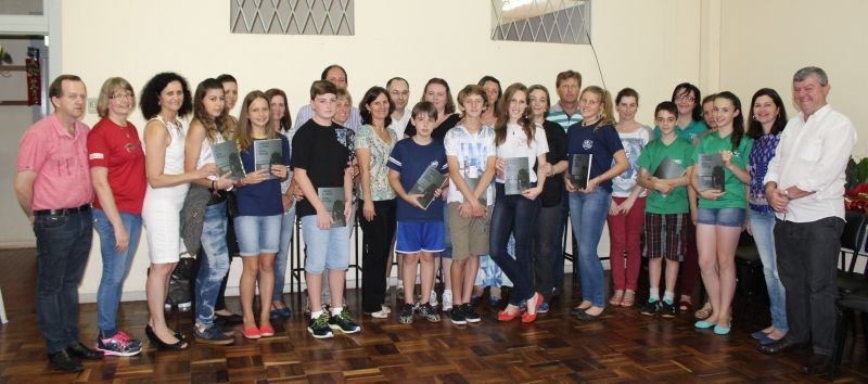 ARROIO DO MEIO – A Secretaria de Educação e Cultura promoveu essa semana uma homenagem aos 25 alunos premiados com medalhas ou menção honrosa em competições regionais e nacionais de matemática e astronomia – Olimpíada Brasileira Matemática das Escolas Públicas (OBMEP), Olimpíada Brasileira de Astronomia e Astronáutica (OBA) e Olimpíada de Matemática da Univates (OMU). Acompanhados dos pais, professores e diretoras, os alunos foram parabenizados pelos resultados e incentivados a alçarem novos desafios. –Se a sala está cheia é motivo de muito orgulho para nosso município. Agradecemos a todos os envolvidos e responsáveis por estes resultados–, enalteceu a secretária de Educação e Cultura, Eluise Hammes. O Prefeito Sidnei Eckert ressaltou os cumprimentos aos alunos, pais e professores, e lembrou que a administração investe 35% do orçamento do município na área da educação, visando qualificar a qualidade de ensino. –O exemplo de vocês serve de incentivo para outros alunos e famílias, provando que com esforço as conquistas aparecem–, afirmou. –É uma conquista compartilhada, com filhos esforçados e pais amorosos que os acompanham–, parabenizou Eckert. O vice-prefeito Áurio Scherer reforçou que a administração prioriza pela educação. –Estamos diante de várias lideranças com futuro promissor–, disse. Gabriel Führ, 13, estudante do 7º ano da Escola Municipal de Ensino Fundamental Princesa Isabel, foi um dos homenageados. Com medalha de bronze na OBMEP e Prata na OMU, o jovem garantiu uma bolsa de estudos para aperfeiçoar o conhecimento. Quando questionado sobre o segredo para o desempenho, a resposta foi objetiva: –muita leitura–. Ao seu lado, pai e mãe orgulhosos acompanhando e incentivando o filho. Legenda: Parte dos alunos premiados, com pais, professores, diretoras e representantes da Administração Municipal. Fotos: Maica Viviane Gebing Texto: Assessoria de Imprensa