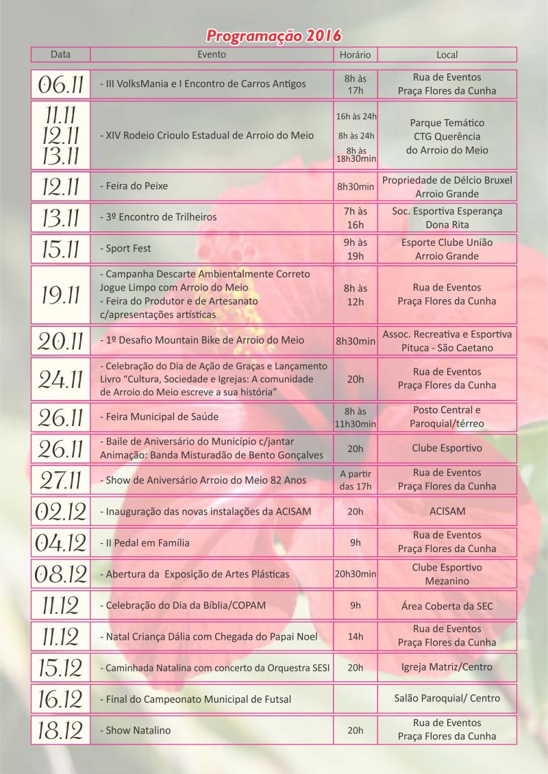 E a programação especial segue durante todo o mês de novembro, numa organização da Administração Municipal, entidades e grupos, como forma de homenagear a comunidade arroio-meense. No próximo final de semana, 11 a 13, é a vez dos tradicionalistas se encontrarem no Parque Temático Municipal, onde ocorre o XIV Rodeio Crioulo Estadual, com provas de laço, chasque e rédeas, numa promoção do CTG Querência. No mesmo final de semana terá Feira do Peixe (sábado, 12 – a partir das 8h30min), na propriedade de Délcio Bruxel, em Arroio Grande e 3º Encontro dos Trilheiros (domingo, 13 – das 7h às 16h), com concentração na Sociedade Esportiva Dona Rita.