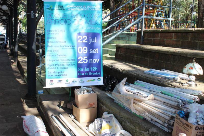 ARROIO DO MEIO – Mais de 900 eletroeletrônicos foram descartados pela comunidade na manhã do último sábado, 22, na Rua de Eventos, durante a 21ª edição da Campanha de Descarte Ambientalmente Correto Jogue Limpo com Arroio do Meio. Outros itens recolhidos foram lâmpadas fluorescentes – 715 unidades; óleo de cozinha – 190 litros; vidros de café e conserva – 300 unidades; pilhas e baterias – 37 quilos; medicamentos vencidos – 20 quilos; papel, papelão, plásticos e garrafas pet – 400 kg e sucatas - 10.
