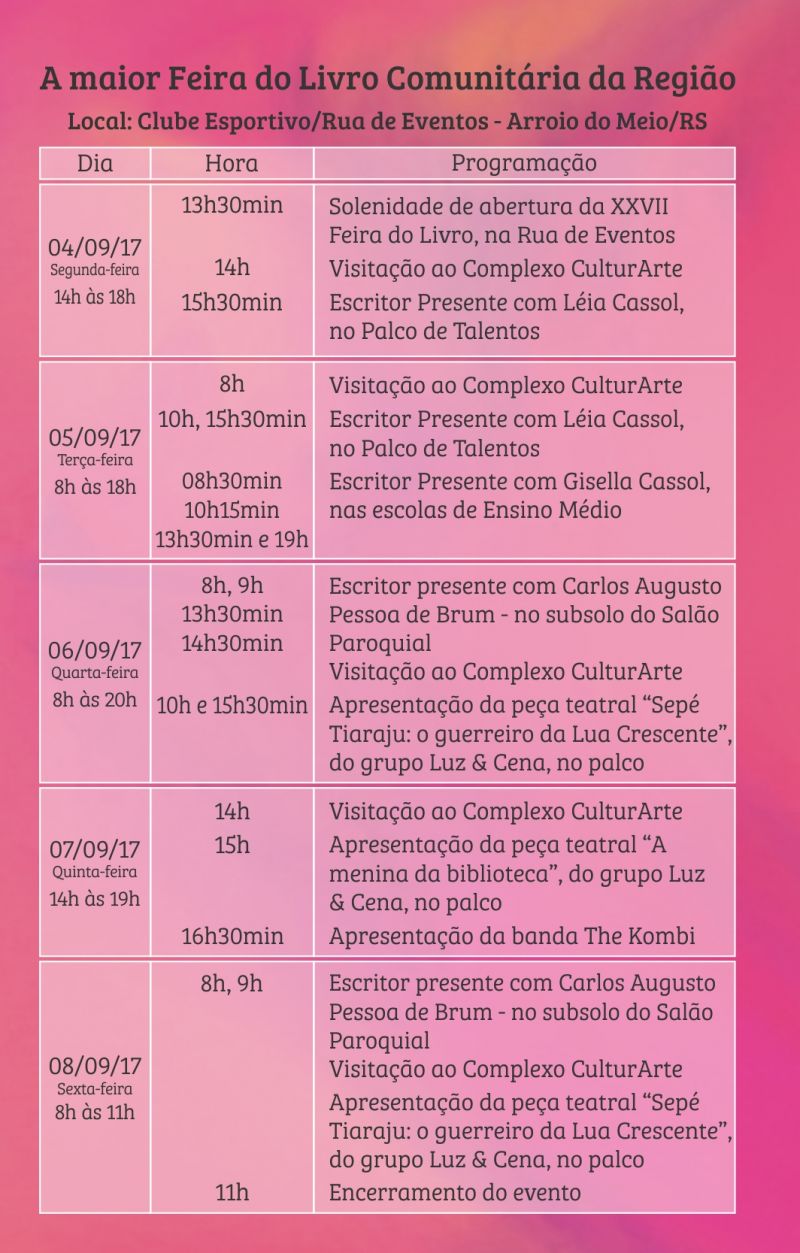 ARROIO DO MEIO – Toda a comunidade está convidada a prestigiar a solenidade de abertura da 27ª Feira do Livro de Arroio do Meio, que ocorre na próxima segunda-feira, 4 de setembro, às 13h30min, na Rua de Eventos. A Feira segue até sexta-feira, dia 8, com apresentações e demais atrações diárias gratuitas para escolas e comunidade em geral no entorno da Praça Flores da Cunha, Rua Coberta e Clube Esportivo, espaço denominado como Complexo CulturArte.
