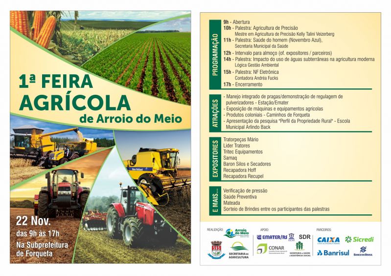A próxima semana será especial para o Setor Primário, com dois eventos realizados em dias consecutivos. Na quarta-feira, 22, ocorre a 1ª Feira Agrícola de Arroio do Meio, das 9h às 17h, na Subprefeitura de Forqueta. Além da exposição de máquinas e equipamentos agrícolas, o dia será composto por palestras sobre Agricultura de Precisão, Saúde do Homem, Impacto do uso de águas subterrâneas na agricultura moderna e nota fiscal eletrônica. Haverá também serviços de saúde, mateada, apresentação de pesquisa da Escola do Distrito, demonstração de regulagem de pulverizadores e sorteio de brindes entre os participantes. A programação segue na quinta-feira, 23, quando será realizado o Seminário Regional sobre Agroindústria e Segurança Alimentar, das 8h às 17h, no CTG Querência. Seis palestras estão programadas ao longo do dia, ministradas por médicos veterinários, engenheiro agrônomo, biomédica e promotor. (Confira programação completa no quadro abaixo).