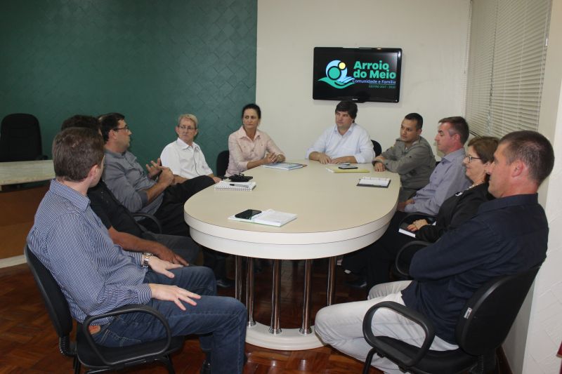 ARROIO DO MEIO – Administração Municipal, Legislativo, Capitão Ricardo Machado da Silva (Brigada Militar), Conselho Comunitário Pró-Segurança Pública (Consepro) e gerentes das instituições bancárias do Município – Sicredi, Caixa Econômica Federal, Banco do Brasil e Banrisul, estiveram reunidos na terça-feira, 27, no Gabinete do Executivo, para tratar de medidas de prevenção e segurança. Na ocasião, o Prefeito Klaus Werner Schnack explanou ações debatidas pelo Comitê Gestor Municipal de Segurança Pública, incluindo o Programa Jovem Aprendiz e projetos esportivos para a ocupação sadia de jovens e adolescentes, assim como o projeto de Videomonitoramento para ruas da cidade e a necessidade da ampliação do efetivo e aparelhamento da Brigada Militar.