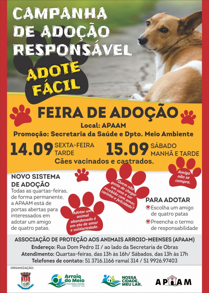 A Campanha prevê a Feira de Adoção de cães vacinados e castrados, a realizar-se nos dias 14 (tarde) e 15 de setembro (manhã e tarde), na APAAM. Após essa data, o novo sistema de adoção será realizado de forma permanente, todas as quartas-feiras e sábados à tarde, mediante o preenchimento do termo de responsabilidade por parte do interessado em adotar. A ação faz parte do programa municipal Nossa Cidade, Meu Lar, incluindo programa de controle de natalidade e cuidados com animais de estimação, visando prevenir a procriação desordenada e futuros abandonos.