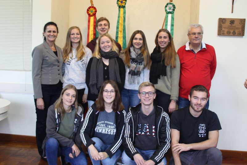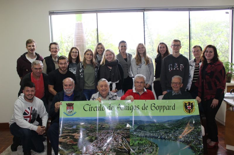 ARROIO DO MEIO – A Prefeita em exercício, Eluise Hammes, junto à Coordenadora do Departamento de Cultura, Carla Schroeder e Círculo de Amigos de Boppard, presidido por Roque Bersch, receberam na tarde da quarta-feira, 3, no Gabinete do Executivo, a terceira delegação de jovens alemães que vem ao Município para intercâmbio, conforme o convênio firmado em 2013 com a cidade de Boppard/Alemanha.