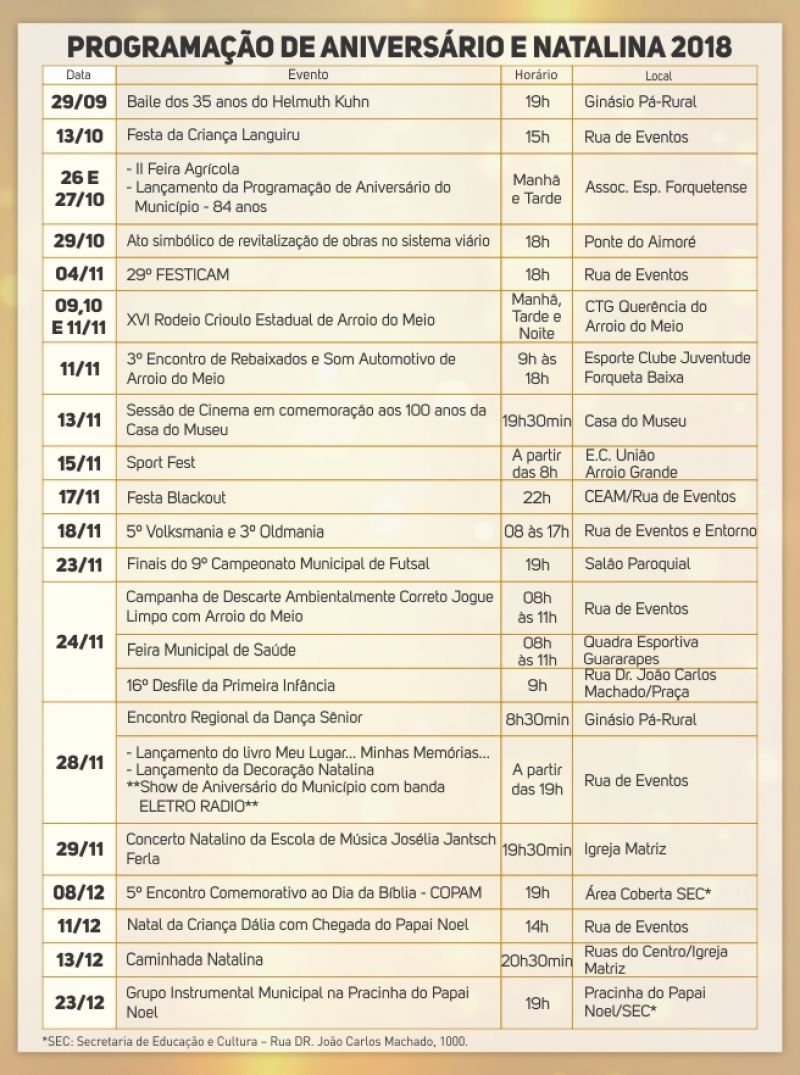 Neste final de semana, dias 9, 10 e 11, ocorre o XVI Rodeio Crioulo Estadual, no CTG Querência do Arroio do Meio, com provas de laço durante os três dias. No domingo, 11, o Esporte Clube Juventude sedia o 3º Encontro de Rebaixados e Som Automotivo, das 9h às 18h. Na próxima terça-feira, 13, às 19h30min, o Museu Público Municipal promove Sessão especial de Cinema no Cineclube Real, em comemoração aos 100 anos da Casa. No dia 14, às 19h, ocorre o lançamento do roteiro turístico Entre Vales e Arroios, na Expovale, em Lajeado. A semana segue com Sport Fest, no feriado do dia 15, no União de Arroio Grande, a partir das 8h e encerra com a 5ª Volksmania e 3ª Oldmania no domingo, 18, das 8h às 17h, na Rua de Eventos e entorno, para apaixonados por carros antigos.