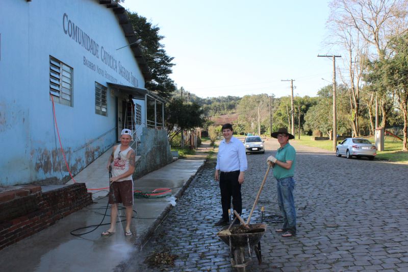 Legenda: Prefeito Klaus Werner Schnack confere melhorias no bairro Novo Horizonte, junto ao Presidente da Comunidade Católica, Aldo Cibulski e morador da rua Ormisdo Dalpian, Ismael Koch, que preparam o entorno para a festa anual da comunidade, dia 1º de setembro.