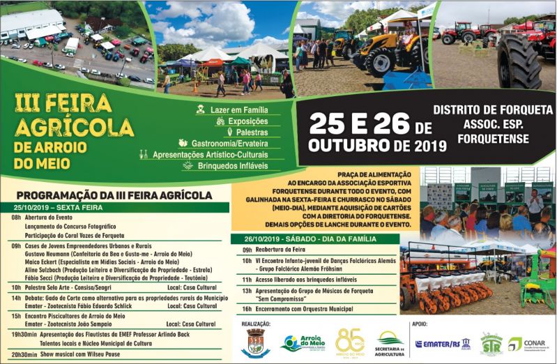 Feira Agrícola de Arroio do Meio, que ocorre sexta-feira e sábado, dias 25 e 26, no Distrito de Forqueta, junto