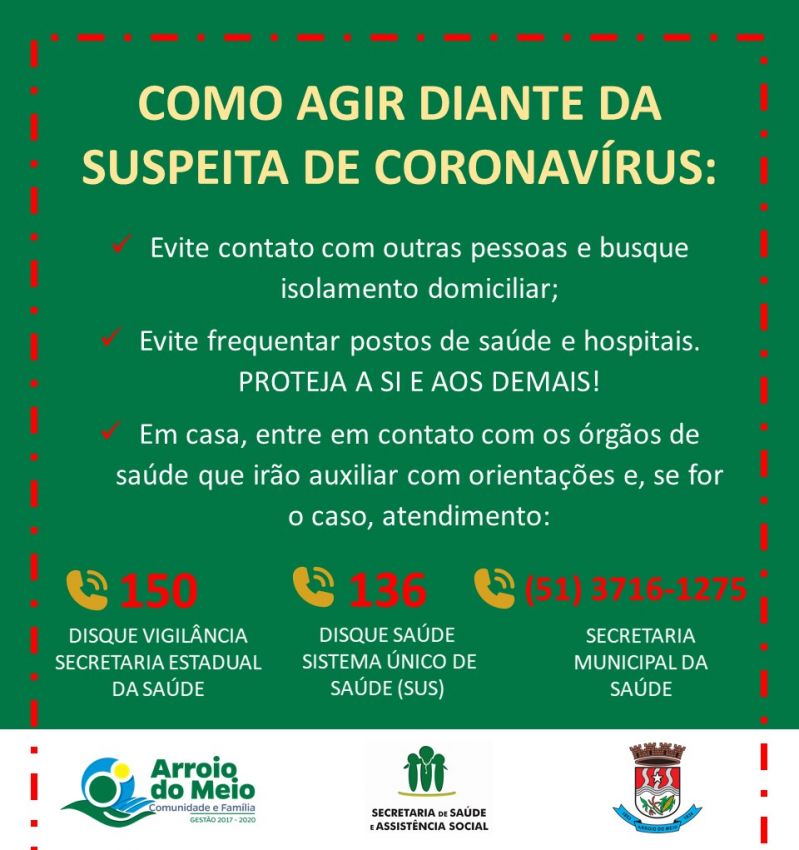 **IMPORTANTE: se a pessoa se considera um caso suspeito, a orientação é que se isole imediatamente o máximo possível, de preferência em casa, e não tenha contato com outras pessoas para evitar a contaminação. A pessoa deve ligar para a Vigilância Epidemiológica do município – fone (51) 3716 1275, das 7h30 às 16h, e falar com a equipe de enfermagem. O caso será avaliado pela equipe da Vigilância, que fará os encaminhamentos necessários para o atendimento de saúde e para coleta de exames, se necessário.