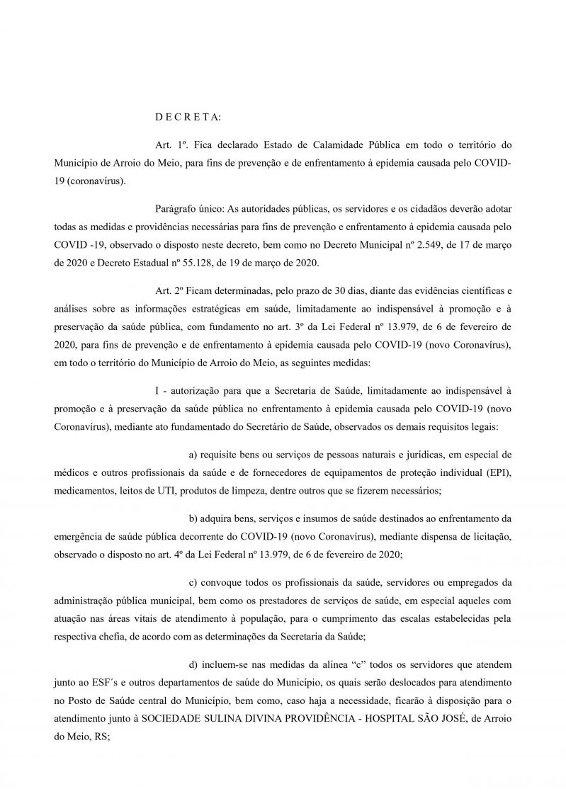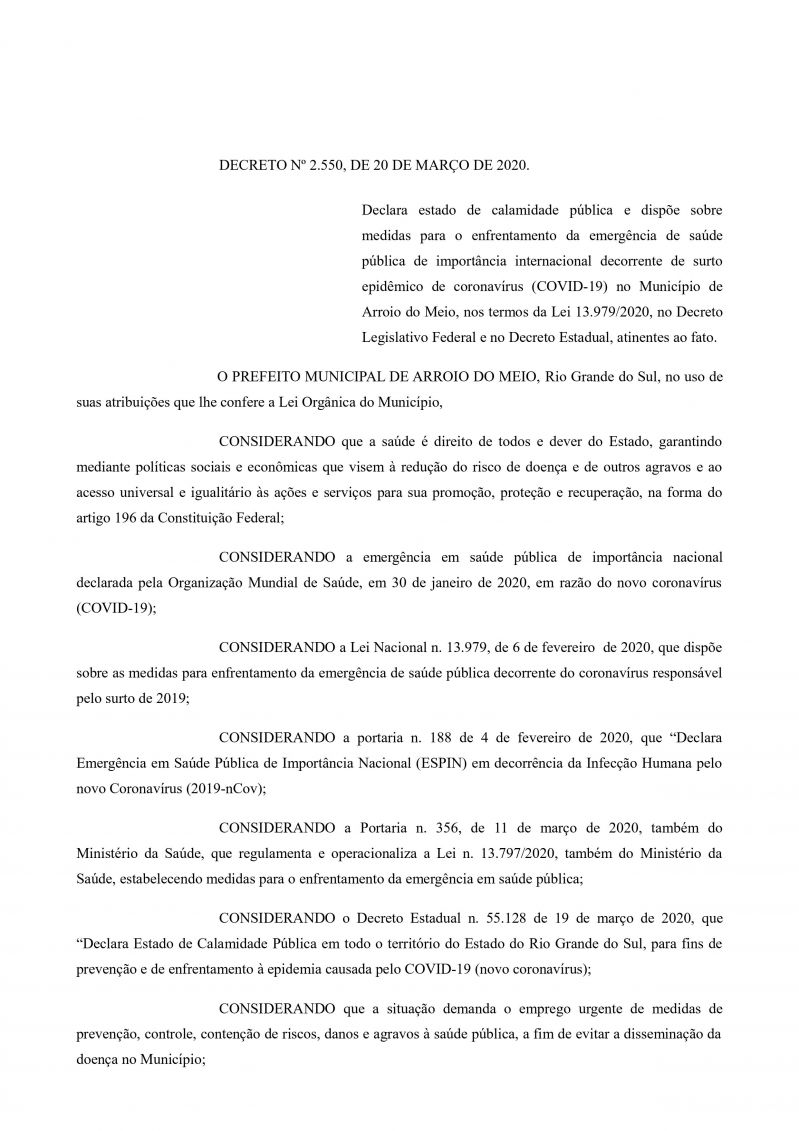 pública através do decreto 2.550, de 20 de março de 2020, e dispõe medidas para