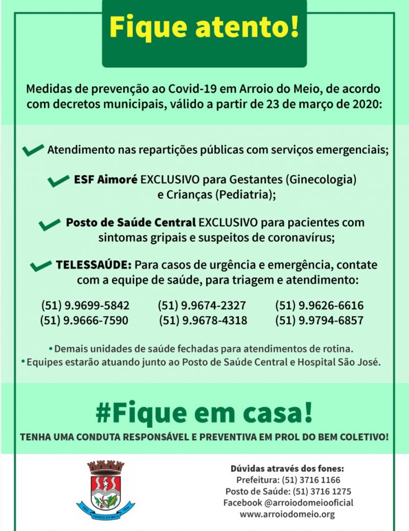 ATENDIMENTOS DA SAÚDE: Outra alteração temporária é em relação ao atendimento nos postos de saúde. A unidade do bairro Aimoré está atendendo exclusivamente gestantes (Ginecologia) e crianças (Pediatria). Já o Posto de Saúde Central, atende exclusivamente pacientes com sintomas gripais e suspeitos de coronavírus. A triagem pode ser feita através do Telessaúde, que também estará disponível para demais casos de urgência e emergência, com atendimento via telefone, migrando para presencial quando necessário. As demais unidades de saúde estão temporariamente fechadas, sendo que as equipes de profissionais estão auxiliando nos atendimentos do Posto de Saúde Central, vacinação da gripe para idosos e organizados para auxiliar o Hospital São José, se necessário.