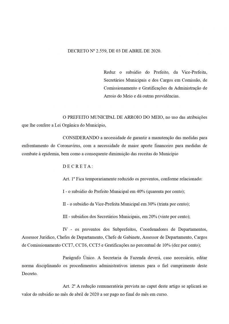 Amparada no decreto 2.559, de 3 de abril de 2020, a Administração Municipal comunica a redução salarial do Prefeito, da Vice-Prefeita, Secretários Municipais e dos Cargos de Comissão, de Comissionamento e Gratificações, assim como o cancelamento de contratos temporários.