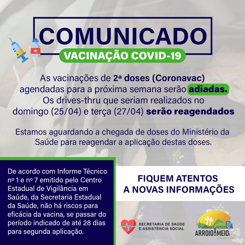 A Secretaria da Saúde informa que as programações de vacinação do dia 25/04(domingo) e do dia 27/04(terça-feira) terão que ser ADIADAS. Essa situação decorre do fato de que não houve entrega do quantitativo total da vacina CORONAVAC(Butantan) no prazo programado por parte do Ministério da Saúde e da Secretaria Estadual de Saúde do Estado.