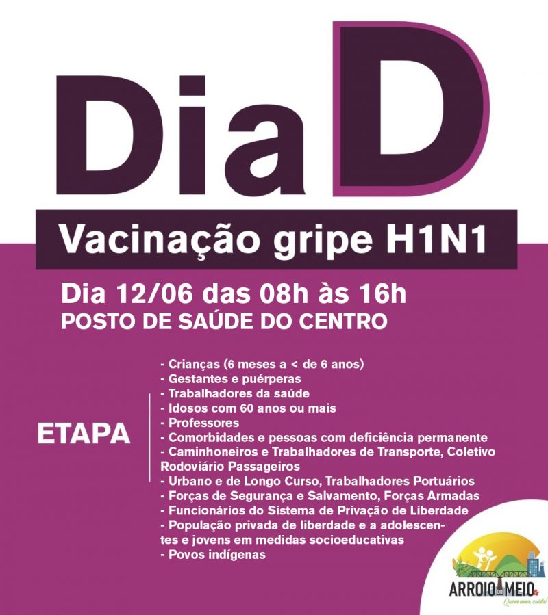 ARROIO DO MEIO – Neste sábado, dia 12, a secretaria de Saúde realiza mais um Dia D de Vacinação contra a gripe (H1N1). A imunização ocorre no Posto de Saúde do Centro, das 8h às 16h. Na ocasião serão vacinadas todas as pessoas que integram os grupos prioritários da campanha.
