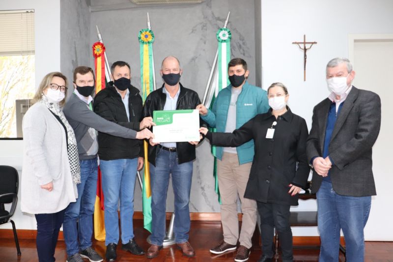 A Cooperativa Sicredi, representada pelos gerentes das agências do município, Fábio Majolo e Jair de Almeida, fez uma doação de R$ 50 mil para a obra da UTI do Hospital São José. O anúncio ocorreu no gabinete do Executivo na sexta-feira, 16, na presença do prefeito Danilo Bruxel, vice, Adriana Meneghini Lermen, secretário de Administração, Áurio Scherer, presidente da Comissão Pró-UTI, Joner Kern e a gerente assistencial do hospital, Rosi Mari Barboza.