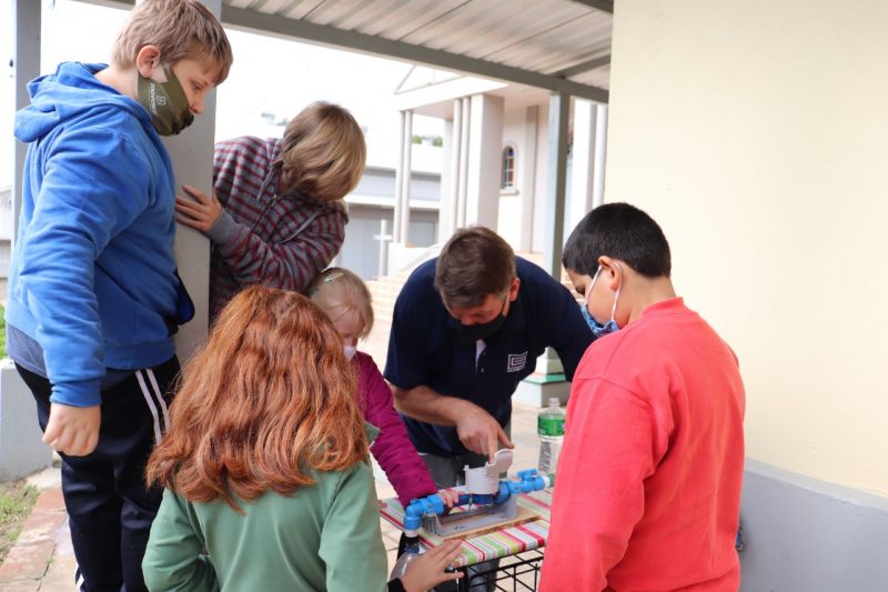 Para os alunos das escolas de Ensino Fundamental, a equipe da Corsan formada por Betina Born, Carine Luísa Lermen e Gerson Hammes abordou o tema “O caminho da água”. Na ocasião falaram sobre a importância da água, os tipos de mananciais, consumo consciente, tratamento da água e distribuição na rede de abastecimento. Após a explicação, foram realizados dois experimentos, um para observar como é medida a água através da passagem pelo hidrômetro e outro para verificar como é realizada a análise de cloro em água de poço artesiano.