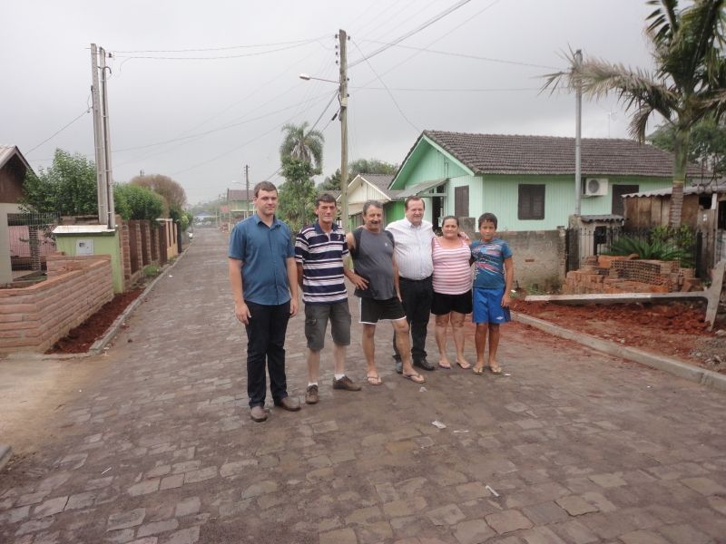 Foi finalizado na última semana o calçamento da rua Almiro Hendges, localizada num dos loteamentos mais antigos do município, que leva o mesmo nome da rua, no bairro São Caetano. Além de 1.105,22m² de pavimentação com pedras regulares de basalto, também foram executados 368 metros de meio-fio de concreto pré-moldado e 141 metros de redes de drenagem no local, num investimento de R$ 73.497,31. A obra foi realizada por uma empresa contratada via processo licitatório, sob os moldes da pavimentação comunitária, que prevê a parceria entre moradores e prefeitura municipal no pagamento da mesma. De acordo com moradores da rua, o pedido pelo calçamento era antigo, devido os problemas de poeira, barro e buracos existentes no local. Morador há cerca de 20 anos da Almiro Hendges, Ocenio Vasco afirma que está muito feliz com o novo calçamento. –Agora tá ótimo, melhorou muito pra nós–, comemora Vasco. Legenda: Prefeito Sidnei Eckert e vereadores Enéias Bruxel e Darci Hergessel conversam com o morador Ocenio e sua esposa, que afirmam estar satisfeitos com a obra. Fotos: Maica Viviane Gebing Texto: Assessoria de Imprensa