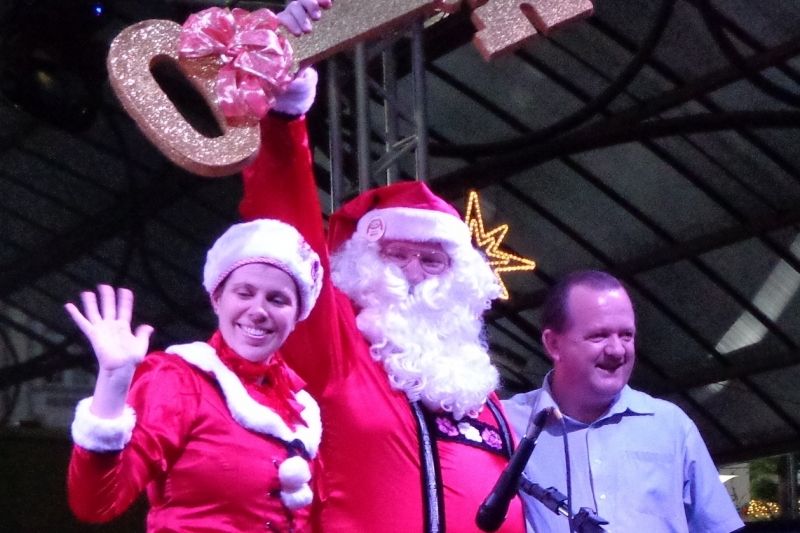 Centenas de pessoas reuniram-se no entardecer de ontem na Rua de Eventos e na Praça Flores da Cunha, para acompanhar a chegada do Papai Noel ao município. Crianças ansiosas pelo encontro com o –bom velhinho–, pais acompanhando seus filhos, jovens, adultos e idosos prestigiaram o evento, que ainda teve mateada com a ervateira Ximango, brinquedos infláveis da BrinquedoTeko e show com a orquestra de Travesseiro. Acompanhado da Mamãe Noel, o Papai Noel apareceu na Praça Flores da Cunha e seguiu até o palco montado na Rua de Eventos, rodeado por dezenas de crianças. Já no palco, recebeu a chave da cidade das mãos do Prefeito Sidnei Eckert, que aproveitou a ocasião para desejar um Feliz Natal e um Próspero Ano Novo para toda a comunidade arroio-meense. Após, os personagens natalinos seguiram para um ambiente montado no calçadão da Rua de Eventos, onde passaram mais de uma hora tirando fotos, conversando e distribuindo doces da Vonpar Alimentos para as crianças. A festa seguiu com o show da Orquestra Municipal de Travesseiro, encantando o público que lotava as arquibancadas, com músicas natalinas e demais clássicos. O evento fez parte da programação –A doce magia do Natal–, numa realização da Prefeitura Municipal e Câmara de Dirigentes Lojistas (CDL), com apoio da rádio Emoção FM. A programação encerra no próximo dia 23, quando haverá show especial com a Orquestra Oclaje, além de mateada, brinquedos infláveis para as crianças e horário especial de atendimento do comércio, que ficará de portas abertas das 17h às 20h30min. Legenda: Papai Noel recebeu a chave da cidade das mãos do Prefeito Sidnei Eckert. Fotos: Maica Viviane Gebing Texto: Assessoria de Imprensa