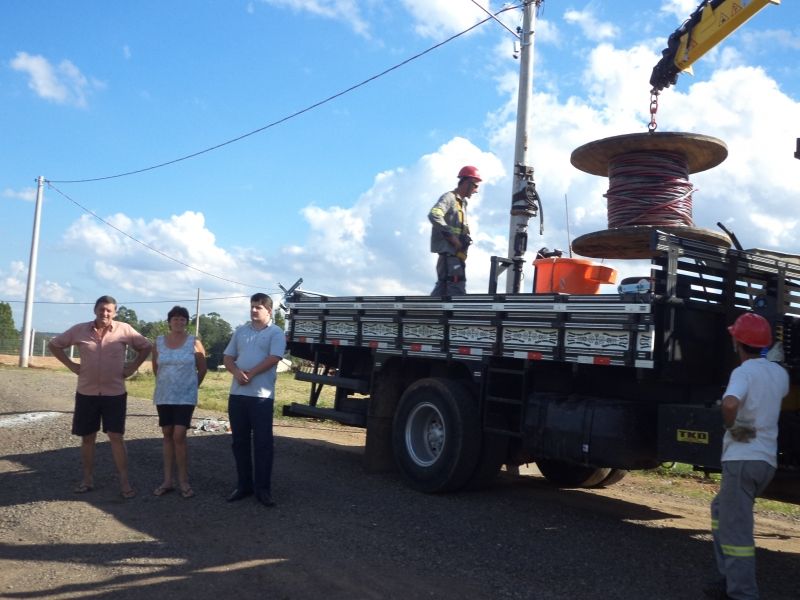 A administração municipal providenciou a instalação de uma rede de energia elétrica na rua C do Loteamento Nova Bela Vista, bairro Bela Vista, para fins de iluminação pública da via. O serviço foi realizado na última semana, por meio de uma empresa terceirizada contratada pelo município, garantindo o fim da escuridão para as quatro famílias residentes no local. O investimento do município foi de R$ 10 mil. De acordo com a moradora da rua, Marlene Jung, o local era totalmente escuro à noite, contando apenas com a iluminação das casas. –A rua era isenta de iluminação, mas agora está uma maravilha, nos sentimos mais seguros–, afirma. Legenda: Secretário de PLanejamento, Henrique Meneghini e moradores da rua companharam o serviço. Fotos: Divulgação Texto: Assessoria de Imprensa