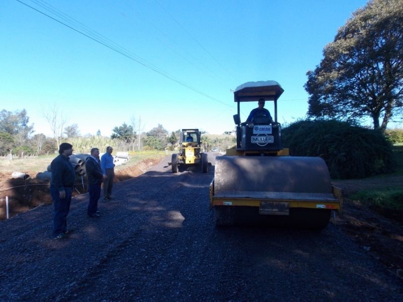 A obra do terceiro trecho do asfalto da Estrada Geral Arroio Grande segue em ritmo acelerado. A empresa Coesul Construtora Extremo Sul Ltda, contratada via processo licitatório, executa essa semana o serviço de base com brita graduada. As próximas etapas são a imprimação e a execução asfáltica. A extensão do terceiro trecho é de 840 metros, iniciando próximo ao entroncamento da rua João Antônio Rauber, mais conhecida como o travessão que liga Arroio Grande à Rui Barbosa, até a propriedade de Inácio Linck. O investimento é de R$ 695.891,49, dos quais, R$ 487.500,00 provenientes de recursos oriundos do Ministério do Turismo, somados à contrapartida do município. Já foram realizadas as etapas de drenagem com execução de travessias, instalação de galeria de concreto pré-moldado, terraplenagem e nivelamento da pista. Em 2012 foram pavimentados mais dois trechos, o que somará aproximadamente 3km de pavimentação asfáltica com o trecho em andamento, num investimento superior a R$ 2,3 milhões. O primeiro trecho corresponde a 720m de asfalto, partindo do bairro Bela Vista, num investimento de R$ 750 mil, via recurso de financiamento junto ao Badesul, com a participação dos moradores locais no pagamento da drenagem pluvial. O segundo trecho foi de 1.060 metros de extensão de asfalto, partindo do ponto pavimentado no primeiro semestre do ano, até o entroncamento com a rua João Antônio Rauber. O investimento foi de R$ 885.241,70, provenientes de financiamento do município junto ao Badesul, somado à contrapartida do município. Legenda: Prefeito em exercício, Áurio Scherer, Coordenador das Secretarias, Klaus Werner Schnack e vereador da localidade, Romano Kunzler, acompanham o andamento da obra. Fotos: Maica Viviane Gebing Texto: Assessoria de Imprensa