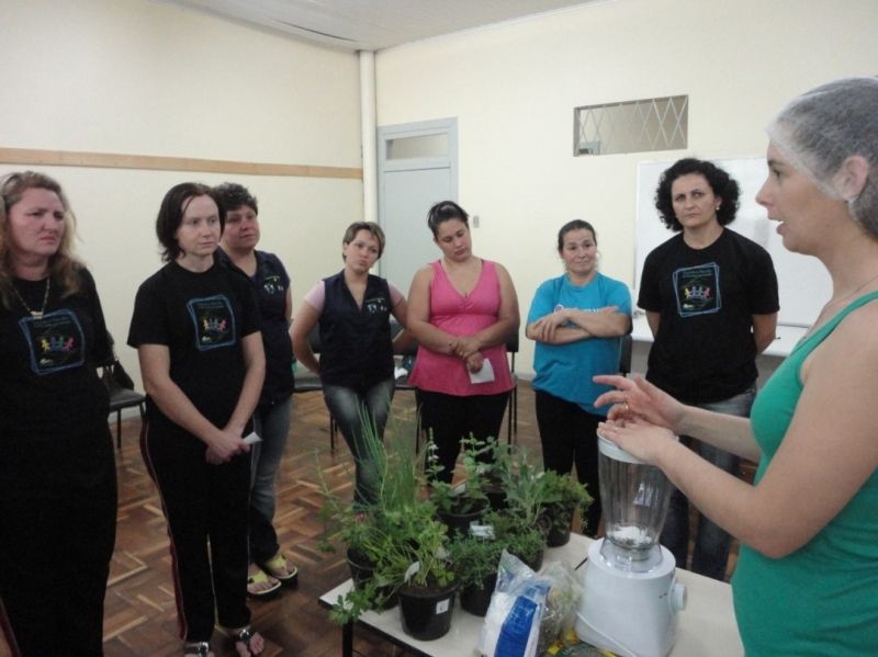 Com o objetivo de diminuir o consumo de sal e qualificar a alimentação dos alunos do município, a Secretaria de Educação, por meio da nutricionista Joice Johann, promoveu um treinamento com as manipuladoras de alimento das escolas. Intitulada de Menos sal, mais saúde, a ação faz parte do projeto Reeducação Alimentar: combatendo a obesidade infantil, que se soma com outras ações realizadas pela administração municipal, em busca da qualidade dos alimentos oferecidos às 13 escolas municipais de ensino fundamental (EMEFs) e oito escolas comunitárias de educação infantil (ECEIs). Desde 2010, a base da alimentação escolar é proveniente da agricultura familiar. O encontro iniciou com dinâmica de integração entre as preparadoras de alimento das ECEIs, e seguiu com orientações a respeito dos perigos do uso excessivo do produto, importância da introdução de ervas naturais no incremento dos temperos e esclarecimentos sobre a pirâmide alimentar. Após, a nutricionista ensinou o grupo a produzir sais temperados com ervas. Ao final do encontro, as preparadoras receberam mudas de temperos que serão plantadas nas hortas escolares. A Secretária de Educação, Eluise Hammes, afirma que essa ação será estendida aos educadores, diretores e pais das ECEIs e EMEFs, por meio de palestras educacionais, com o objetivo de levar orientações para melhorar os hábitos alimentares, contribuindo para o bem estar e a saúde dos alunos. Legenda: Nutricionista ensinou receitas de sais temperados com ervas naturais. Fotos: Maica Viviane Gebing Texto: Assessoria de Imprensa