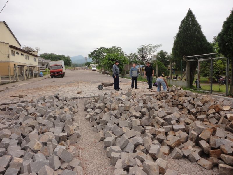De um lado da rua, as aulas seguem normalmente na Escola Municipal de Ensino Fundamental (EMEF) Princesa Isabel. Do outro, as crianças brincam e se exercitam na pracinha da Escola e na Área de Lazer do bairro. Ao centro, os operários da empresa Britagem da Pedra Ltda executam o calçamento da rua que corta os três importantes e movimentados pontos do bairro Rui Barbosa. Trata-se da pavimentação do entroncamento entre as ruas São Martinho e Olávio Bertholdo Träsel, que aos poucos vai deixando o barro e a poeira como lembranças do passado. No local ainda se encontram o Ginásio Municipal e o Esporte Clube Rui Barbosa. A pavimentação com pedras regulares de basalto soma 3.348 m² de calçamento, além de 98 metros de rede de drenagem e 286 metros de meio-fio de concreto pré-moldado. O investimento é de R$ 184.585,48, dos quais, R$ 146.950,00 de emenda parlamentar do Deputado Afonso Hamm, via Ministério das Cidades, somado a contrapartida do município. A conclusão está prevista para os próximos dias. –A obra facilita o acesso à escola e pracinha utilizada como nosso pátio, assim como a limpeza e manutenção do ambiente escolar, além de dar uma nova visão para o local–, comemora a diretora da escola, Marli Horn Körbes. Além destas, mais cinco ruas foram pavimentadas este ano de forma comunitária ou associativa nos bairros Bela Vista (Guerino Pivatto, Bela Vista/Glória, rua das Rosas) e Centro (Theobaldo Brentano e Coronel Zimmermann). Em Arroio Grande, foi executado o terceiro trecho do asfalto da Estrada Geral. Já a rua São Cristóvão, do bairro Barra do Forqueta, está licitada e aguarda liberação para o início. Assim como as ruas Euclides da Cunha, Castro Alves e 29 de Maio, do Loteamento Glória/ bairro Bela Vista, que seguem em processo de análise na Caixa Econômica Federal, para liberação de emenda parlamentar e posterior execução. Legenda: Prefeito Sidnei Eckert, Coordenador das Secretarias Klaus Werner Schnack e Secretário de Obras Paulinho Volk vistoriaram a obra na última semana. Fotos: Maica Viviane Gebing Texto: Assessoria de Imprensa